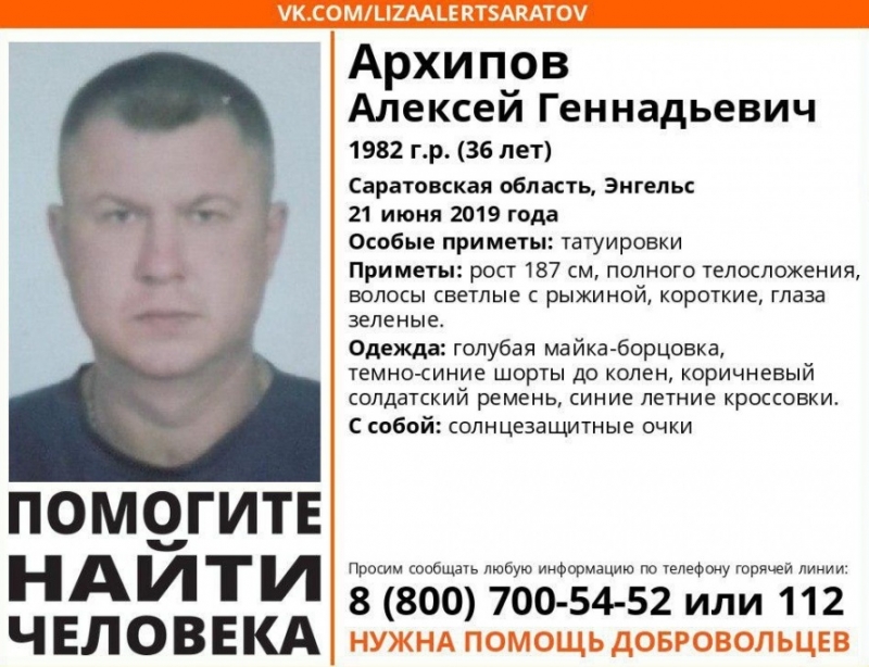 О местонахождении Архипова Алексея Геннадьевича 1982 года рождения не было ничего известно с 21 июня 2019. К поискам покровчанина полного телосложения с короткими светлыми волосами и зелеными глазами присоединились добровольцы поискового отряда «Лиза Алерт».
