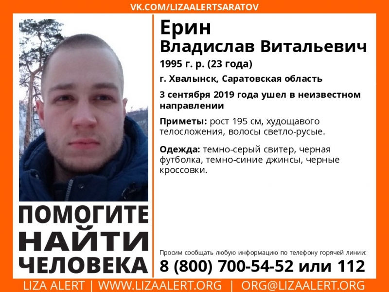 В Саратовской области ведется поиск Ерина Владислава Витальевича 1995 года рождения. Молодой человек пропал 3 сентября 2019 года в Хвалынске. Об этом сообщается в сообществе поисково-спасательного отряда «Лиза Алерт» в социальной сети «ВКонтакте».