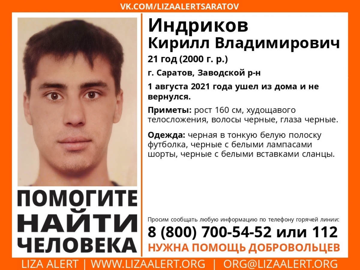 В Саратове завершились поиски Индрикова Кирилла Владимировича 2000 года рождения. Юношу из Заводского района областного центра искали с 1 августа 2021 года.