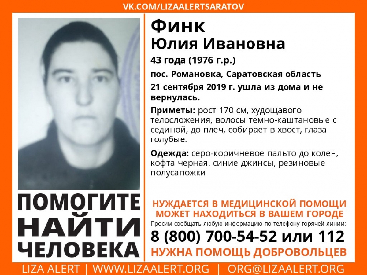 В Саратовской области завершены поиски Финк Юлии Ивановны 1976 года рождения. О местонахождении 43-летней жительницы поселка Романовка ничего не было известно с 21 сентября 2019 года.