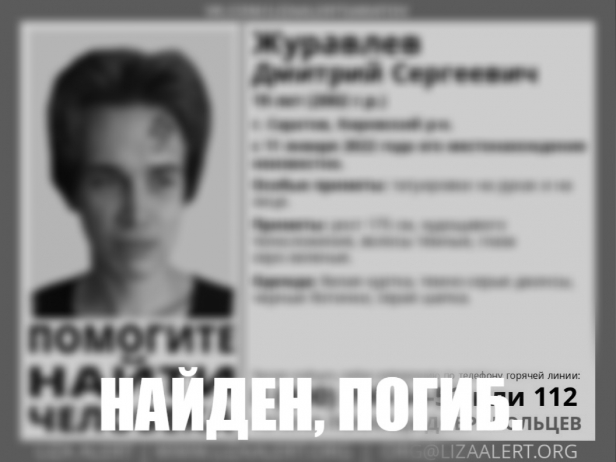 В Саратове прекращены поиски Журавлева Дмитрия Сергеевича 2002 года рождения. О местонахождении 19-летнего юноши из Кировского района областного центра ничего не было известно с 11 января 2022 года.