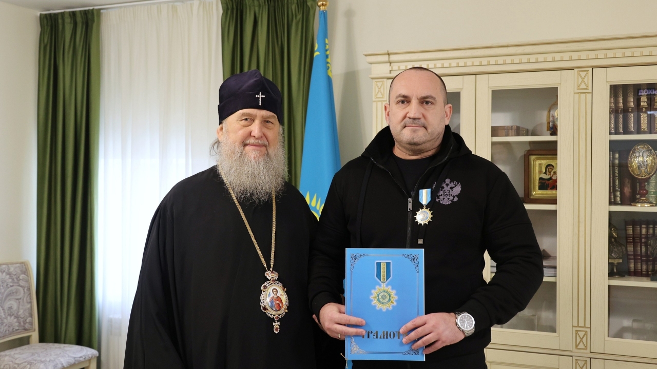 Владыка вручил Вячеславу Калинину церковный орден «Енбек Үшiн» (За труды), поблагодарив команду федерального медиахолдинга Ветеранские вести за медийную поддержку проектов Церкви, информирование и духовное просвещение граждан, информационное противодействие чуждым нашей нации морально-нравственным «ценностям».