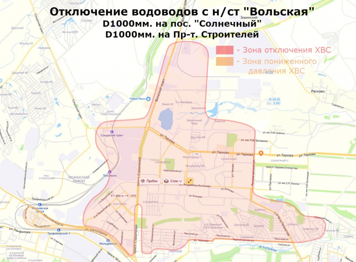 Схематически зоны отключения и снижения параметров подачи холодной воды обозначены на прилагаемой карте северной зоны Саратова.