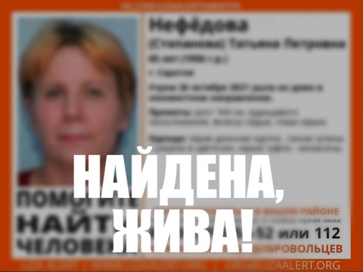 В Саратове прекращены поиски Нефёдовой (Степановой) Татьяны Петровны 1956 года рождения. Утром 26 октября 2021 года женщина ушла в неизвестном направлении и пропала.