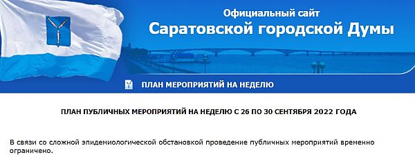 На сайте Саратовской городской думы в разделе «План мероприятий» появилось сообщение о том, что публичные мероприятия отменены. В качестве причины названа сложная эпидемиологическая обстановка.